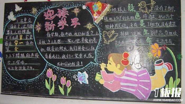 这幅新学期黑板报主旨突出,色彩搭配靓丽,插图生动,文字书写规范,设计富有创意,值得欣赏!