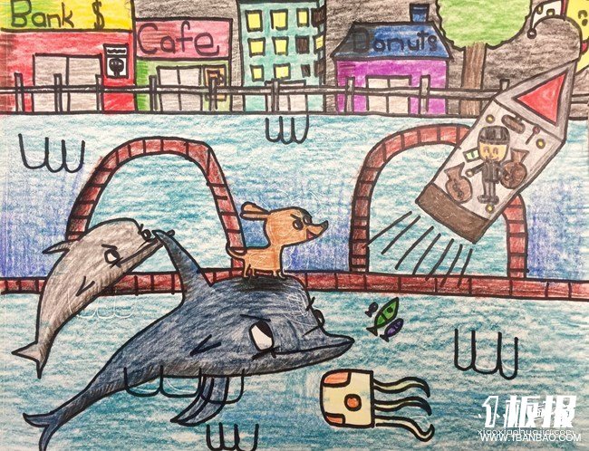 坐着火箭逃跑的抢劫犯,海豚、狗狗们紧追不舍,一副追赶到底的模样。很有趣的蜡笔画作品,都可以发散思维,改编出一部动画片来啦~喜欢的同学来创作后续发生的故事吧~