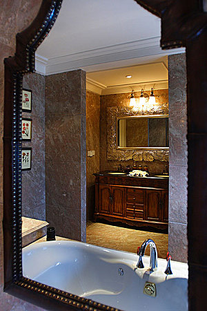 标签:厕所卫生间洗手间玻璃灯吊灯透明水龙头室内水槽盥洗室柜子静物镜子特写内景无人款洗室竖构图正面照装饰画欧式浴缸