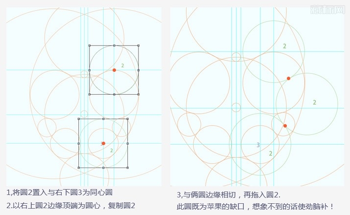 通过不同的圆相切,获得标志的各处曲线、弧度和转折数据,并证明这些数据的必要性和合理性。比如苹果logo,缺口、叶子、上端凸起和下端凹进,相应圆形直径是一致的。