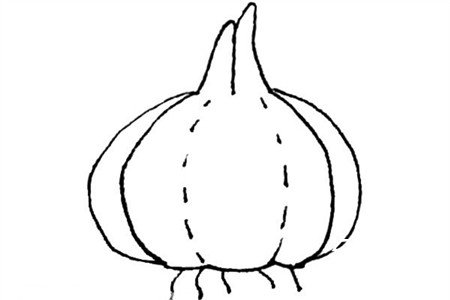 接着我们在蒜头的两边用两个括弧画出另外几片蒜瓣。然后在圆形的里头用虚线画出蒜头中间的蒜瓣。如图