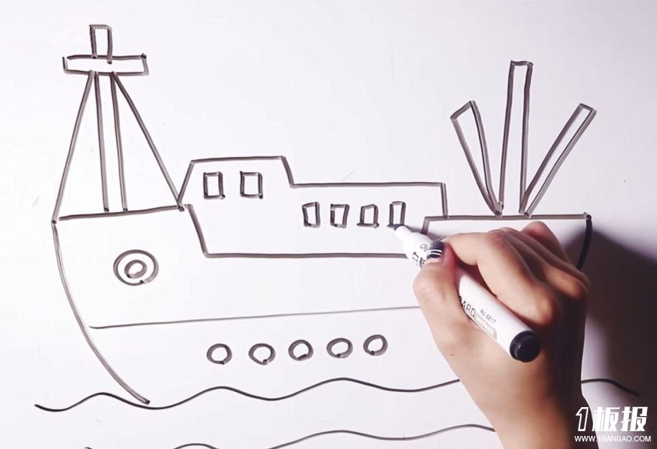 首先我们用两条波浪线画出海浪,然后在海浪的上头画出一个半圆形的船身。接着我们在船身上画出舷窗和垂直的柱子。如图