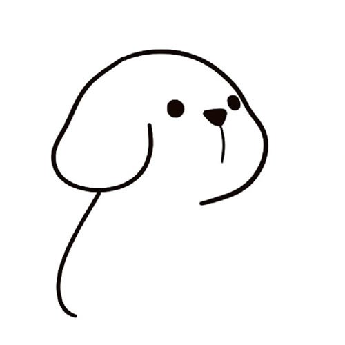 耳朵画好后,我们来画小狗圆圆的黑眼睛和鼻子。这样小狗的脸大致就好了!然后顺着耳朵的中线往下。我们画出小狗的背部线条。