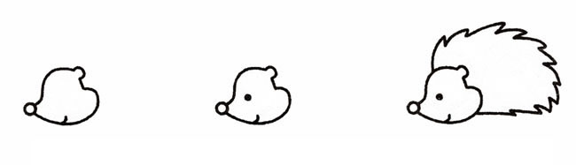 首先在画面靠左的一侧画出刺猬的头部侧面,注意刺猬的鼻子尖尖,耳朵小小圆圆,之后延伸头部线条,画出刺猬的背部,背部线条为尖刺状,如图