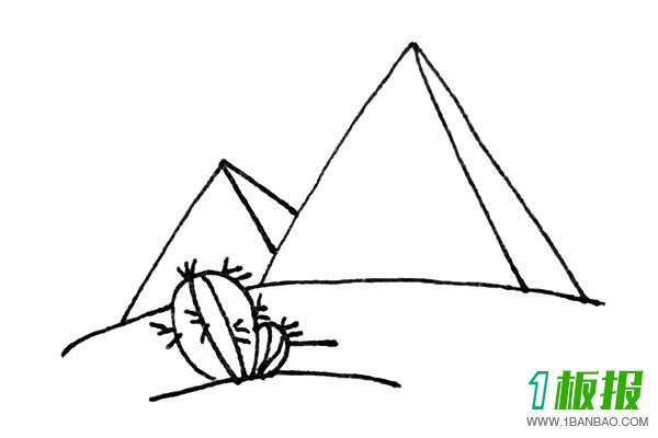 在仙人球两侧延伸一条弧线,右侧画出一个较大的三角形,并且在三角形的右侧再画一个三角形,让其更立体,同样的画法在左边再画一个小一点的金字塔,注意遮挡