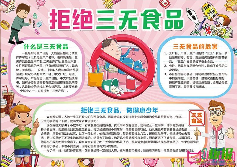 三无食品的危害是非常大的,三无食品一般是指无生产日期、无质量合格证和无生产厂名称的。本期板报网小编为大家带来食品安全手抄报图片,拒绝三无食品。希望大家喜欢!