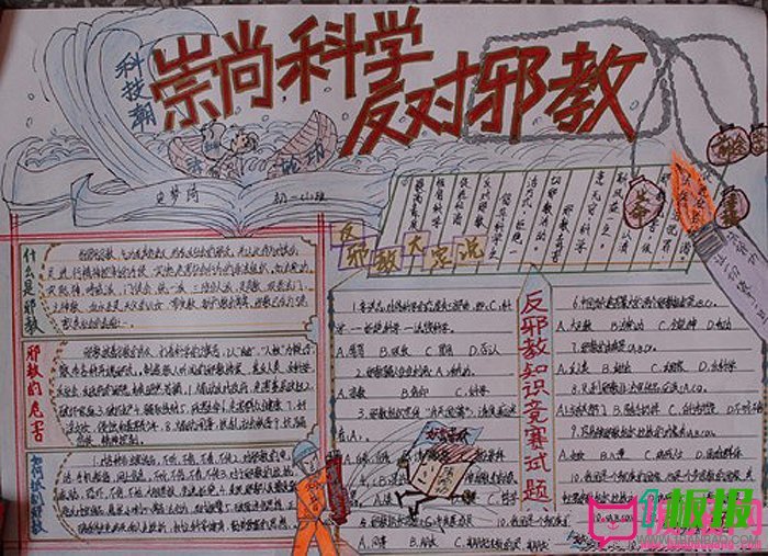 反对邪教组织的斗争,是科学与伪科学、文明与愚昧、争议与邪恶的斗争,我们要尊重生命,让生活更加有意义,我们要共同加入到反邪教的行列中来,尽我们最大的力量,创造文明和谐的校园环境。下面板报网小编为您带来反邪教手抄报图片大全,不让邪教玷污校园,希望你们喜欢!