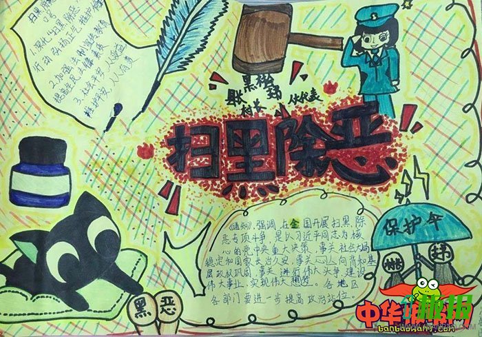 近几年来,我们的国家一直在打击黑恶势力,但是今年正式将打黑升级为扫黑,可见政府对于黑恶势力的态度是零容忍的,坚决清扫危害社会安稳的黑恶势力。这项活动的意义就是保民生,为的就是维护人民群众的利益,提升人民生活的幸福感。今天中华板报网小编为大家带来2018年扫黑除恶手抄报小学生,弘扬正气,我们一起来画一份漂亮的扫黑除恶手抄报吧!
