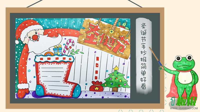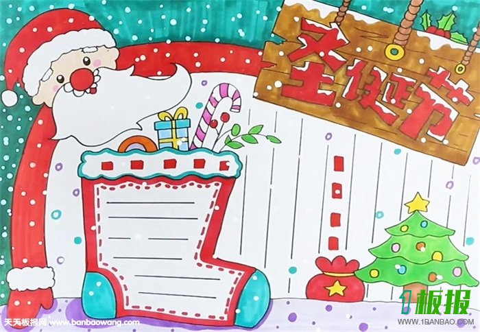 圣诞节手抄报简单好看怎么画先画出圣诞老爷爷,再画出报头,然后画出礼物袋和圣诞树,先给圣诞老爷爷涂上红色,木板涂上棕色,背景涂青色,文字涂上红色,再补充其它颜色,背景涂上白色雪花,最后画上文字栏,简单好看的手抄报就完成了。