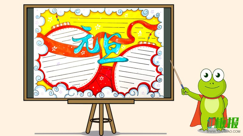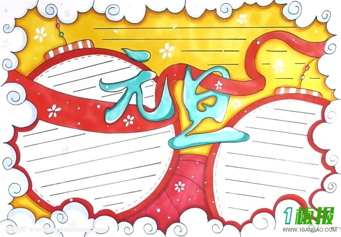 先在中间写上元旦两个字,接着画上一圈不规则波浪形状的云朵边框,然后在空白处画上两个圆圆的大灯笼,还有一条绸缎,最后再涂上颜色,并在边框里画上横线,这样,关于元旦节的手抄报就完成了。