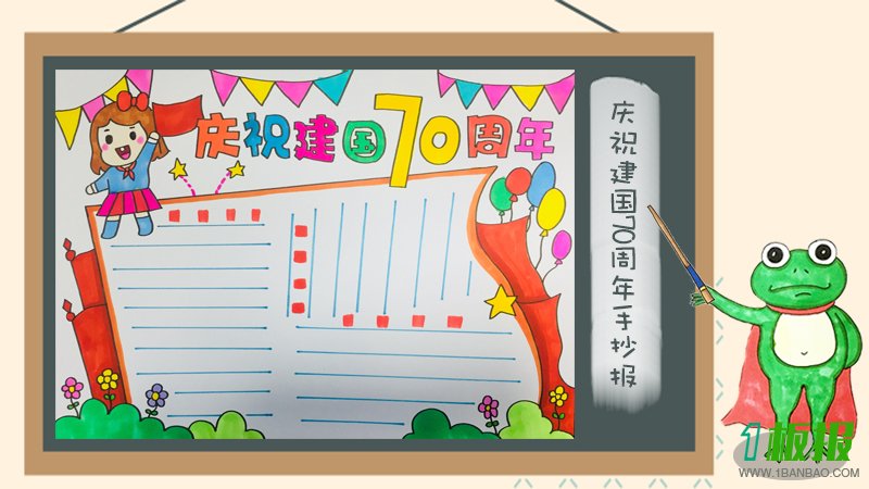 先画出报头与挥舞着红旗的小女孩,画出底部的草丛花朵,再将边框画出来,画上气球与挂幅装饰,将报头与气球挂幅涂成多彩颜色,给女孩与草丛花朵涂好颜色后,边框涂红,再画出文字栏,庆祝建国70周年手抄报手抄报就画好啦。