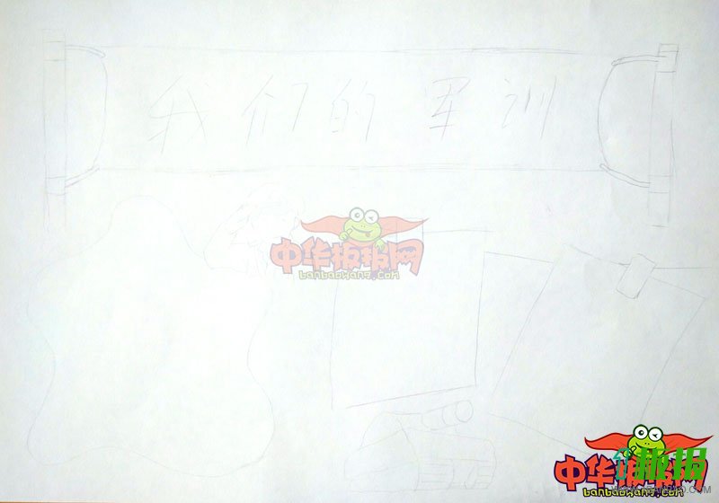 2、然后呢,我们就用黑色水性笔开始描出我们前面用铅笔画的版面,我们先画手抄报上部分的横幅,然后画敬礼的军人,还有下面的一辆坦克车,军训就是这么帅气!