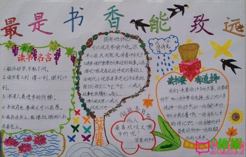 书在柜里,蒙尘许久。换做日日酒乐。俗尘的酒,是沾不得墨。像是齐桌的鱼肉,早在一片喧哗中,高昂着世间的繁华与浮躁,与书香隔着远远的距离。或许,堂皇的酒屋里,裱挂着一副墨笔,撇捺之间,不待细细品味。早被推杯换盏之间冲的无影。下面板报网小编为您带来读书手抄报图片大全,最是书香能致远,希望你们喜欢!