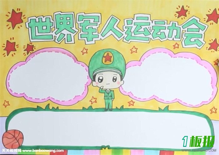 先画报头与就画好啦敬礼的军人,再来画出三个边框,画出地面线条与装饰物后,将报头涂绿,边框分别用粉色与绿色描边,给军人上好颜色,背景底色全填上黄色,地面则涂成多彩条纹的样子,画出文字栏,第七届世界军运会手抄报就画好啦。