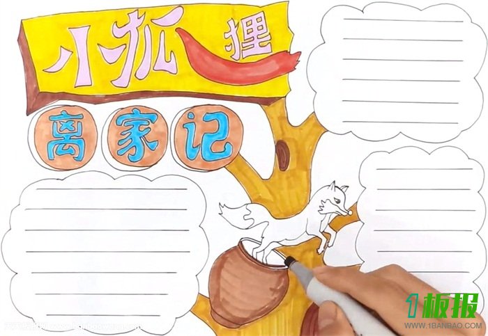 先画出上方的报头,下面画一只从罐子里跃出的小狐狸,然后画几个边框,画上文字栏,给报头上色,然后给大树涂上棕黄色,狐狸涂红色,小狐狸离家记手抄报怎么画背景涂上绿色,简单的手抄报就画好了。