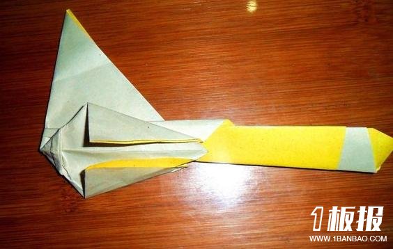 10、将正面的三角形对折。下面几个步骤类似于千纸鹤的折法。