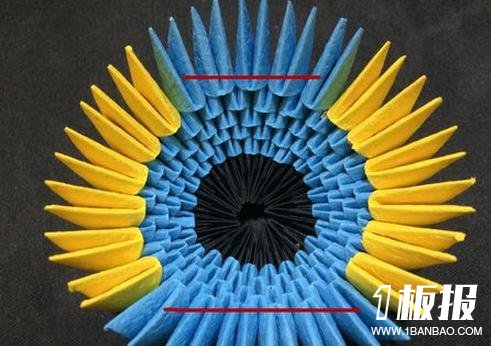 5、随便找个方向在前面插上6个蓝色的三角插,对应的后方插上5个三角插,其它的插上黄色的三角插,如图。