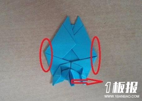 16、把尾巴的部分折向一边,然后把圆圈内的部分进行“Z”字形折叠,作为龙猫的胳膊。