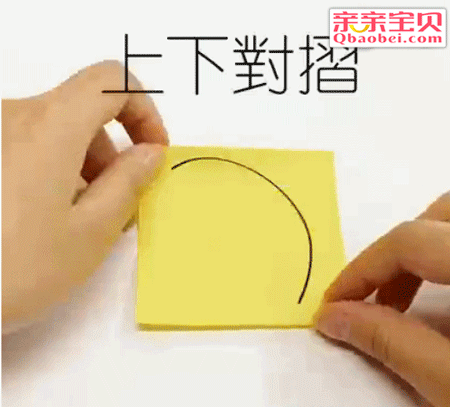 将一张正方形黄色贴纸上下对这、左右对折,留出折痕。
