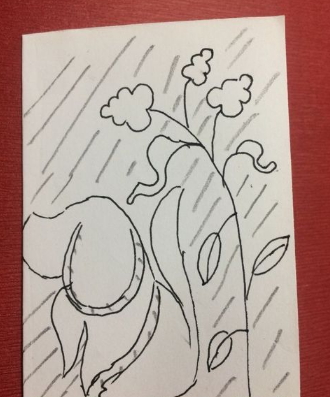 我们先从小花草开始剪,叶茎很细要慢慢剪,别剪断了。继续沿着画线把花草剪下来。花草与狗狗连接处剪出一条边,不要剪开了。