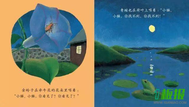 青蛙也在荷叶上唱着:小猫,小猫,你找不到,你找不到!