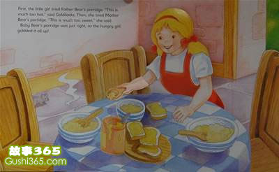 没过一会儿,金发女孩来到棕熊家。她连门都没敲,就直接闯了进去。餐桌上摆着三个碗,碗里是香喷喷的粥。不能怪我,不能怪我!金发女孩一边自言自语,一边捧起那个最大号的碗。