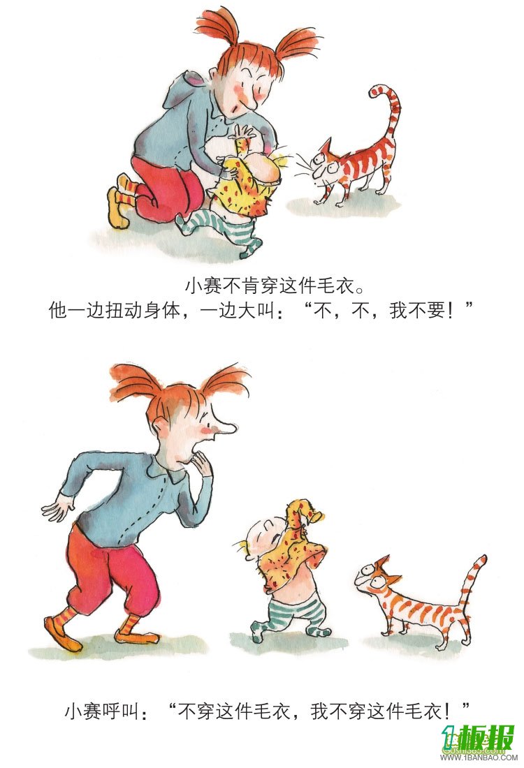 洗完澡,妈妈说:过来,穿上这件保暖的毛衣 。
